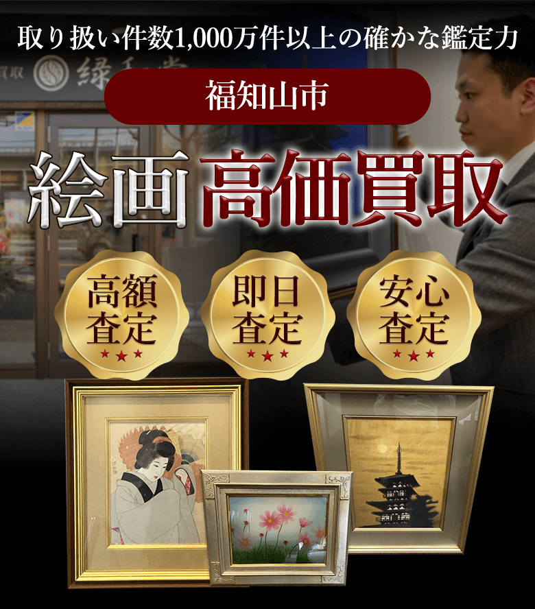 京都府福知山市(和久市町・土師宮町・広峯町など)で絵画買取専門店のご利用をご希望される方は緑和堂まで。在籍している絵画専門鑑定士が日本画や洋画から、現代アートまでを適正に査定を実施し、他に負けることがない買取価格をご提案できます。