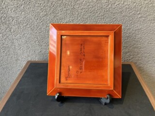 本作は中村宗哲が製作した四方盆に、飛騨春慶が画賛(詩文)を入れたものになります。今回で言えば、松尾芭蕉の詩の写しとなります。四方盆は茶の席では菓子を入れる器であり、春慶塗の色合いはより茶菓子を引き立てそうですね。