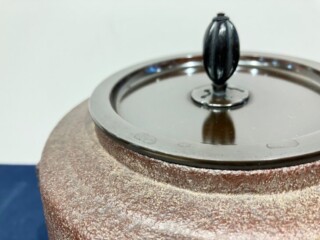 こちらの作品は、線で遠山の山並みが描かれ、山の部分には霰模様が施されています。霰釜は、茶の湯釜の形状の一つで、地肌に粒状の細かな突起を浮き出させた釜を指します。共箱・本品ともに状態が良好であったため、こちらの評価とさせていただきました。