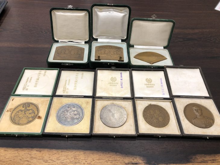 大正に制作された『東宮殿下御成婚記念の銅牌』や『第一次世界戦役講和条約調印記念メダル』など、初めて手に取る珍しいお品物ばかりでした!