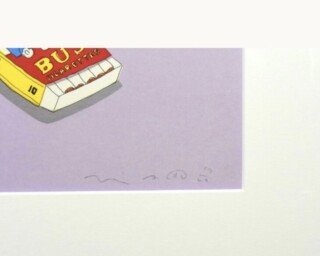 『玩具とシガーケース』は、一見シンプルなデザインですが、玩具の人形が静かにシガーケースを見つめているのが印象的な作品です。穏やかなタッチ感の中にユーモアある作品が人気作品となっています。今回はシルクスクリーン版画作品であり、若干の汚れが一部小さくありましたが、作家の中でも人気のモチーフであることから、上記評価額となりました。