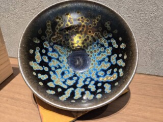 元々の曜変天目茶碗は中国南宋の時代に作られていたとされ、虹色に輝く大小の斑紋が特徴のお品物です。オリジナルの技術はすでに失われてしまっており、現存するものは世界に3点しかないと言われています。