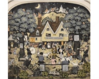 こちらのクラークの作品は、「The Sweet Nightingale」と看板の立った建物と、その庭で音楽に興じる人々を描いた作品です。