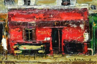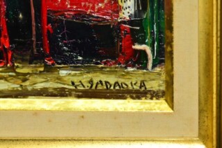 今回のお品物『カトリーヌ』は、正面を向く様子である一軒のカフェを描いていますが、赤の色彩が定岡らしい力強さがある様に込められて描かれていますが、人物も描かれている通り、どこかにある穏やかな日常風景らしさも感じられる、描き方の緩急が鋭く描かれているところが特徴的です。