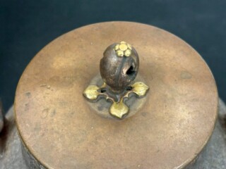 本作は、粗い鉄肌に花鳥や山水、松や梅などの文様が彫り込まれ、緻密な金銀象嵌が施された、非常に見応えのある一品です。鉄肌と金銀との美しいコントラストに加え、虫食いが施された特徴的な摘みや花形の台座など、細部にまで意匠が凝らされ、全体を華やかに演出しています。