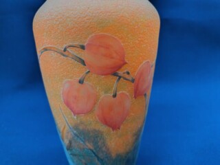 今回のお品物では、上部にはオレンジ色をベースにホオズキの実が大きく描かれており、下部には葉の緑色と2つの色が繊細に重ねられています。全体の柔らかな色合いが、見る者を暖かな気持ちにさせてくれる一品です。