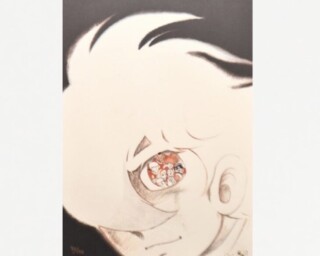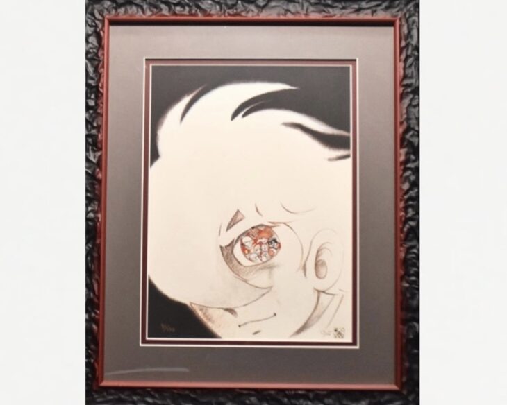 本作『スマイル・アゲイン』は、「サイボーグ009」をモチーフとしたアート作品です。とりわけ印象的なのは瞳の表現で、その中にはサイボーグ戦士たちが集合して描かれています。主人公・島村ジョーが、常に仲間たちを心の中に抱きながら戦い続けている姿を象徴的に表した一作と読み取ることができます。