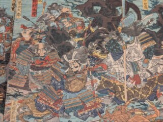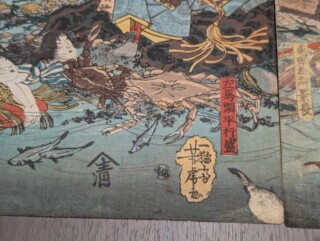 こちらの作品は水中で三種の神器を探す平家の武士たちが描かれているものです。もちろん史実ではなく源平合戦の内、壇ノ浦の戦い後失意のうちに滅亡した平家の武士たちが怨霊となって現れるといった創作が江戸時代に流行し、浮世絵でも表されました。海の底なので魚や蟹といった生物も描かれています。特に蟹は関門海峡で捕れる平家蟹と思われ、芳虎のユーモアも見られる作品となっています。