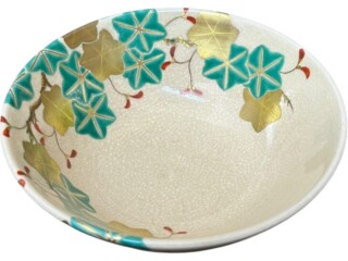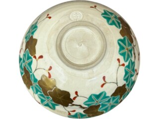 青楓(あおかえで)をモチーフにした茶碗で、青〜緑の楓の葉の絵付けが特徴的です。青楓のモチーフは、新緑〜夏〜初秋あたりの季節感を表現することが多いです(紅葉とは対照的に、青〜緑の楓)。“青楓”という言葉自体が、夏から初秋の風情を感じさせるものです。