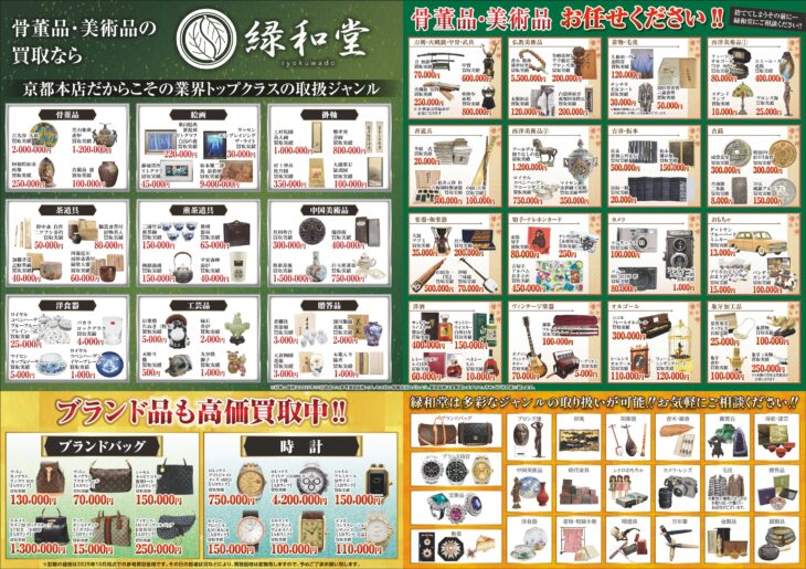 絵画、掛軸、茶碗や花瓶、茶道具、煎茶道具、刀剣、武具、甲冑、中国骨董、西洋骨董、ブロンズ、置物、着物、喫煙具、書道具、香木、古銭、レトロおもちゃ、切手、お酒、ペルシャ絨毯、金製品、銀製品、ブランド品、時計…e.t.c