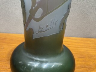 本作は、ガレらしい自然賛美と詩的感性が見事に表現された逸品です。涼やかなブルーからグリーンへと移ろう色彩のグラデーションの中に、フロックス(オイランソウ)の花が優美に咲き誇る姿が、被せガラス技法によって緻密に描き出されています。