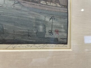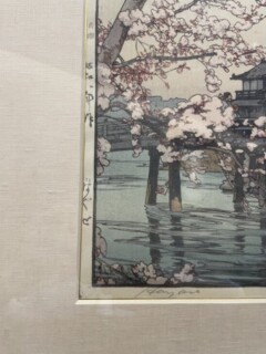 本作は、昭和8年に制作された作品で、桜咲く水辺の情景を題材としています。水の流れの躍動感ある表現や、古風な建物の細部に至るまで、吉田博ならではの精緻な技法が随所に見て取れます。