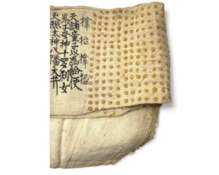 布には「天諸童子以為給使 鬼子母神十罗刹女 天昭太神八幡大井 妙法蓮華経序品第一 梵天帝釈四大天王 妙見大井摩利支天 諸蝕怨敵皆悉摧滅」および「サムハラ」といった文字が記され、その周囲には多数の結び目が施されています。法華経をはじめ、仏教・神道の諸尊を広く勧請し、あらゆる守護の力によって身を守ろうとする、強い祈願が込められた一品です。
