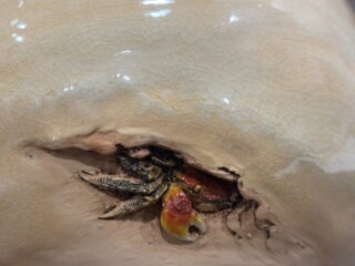 本作『蟹彫刻 抹茶碗』は、やわらかな丸みをもつ抹茶碗の胴部から、蟹がひょっこりと姿を現すように彫刻された一作です。淡く落ち着いた釉調の器肌には細かな貫入が入り、そこに彩色された蟹の鋏や脚がさりげないアクセントとして映えています。主張しすぎない造形でありながら、見る角度によって表情が変わる点も、この作品ならではの魅力といえるでしょう。