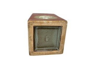 本作『辰砂釉象嵌草花文 方壷』は、方形の壷に辰砂釉を施し、象嵌で草花文があしらわれた逸品です。島岡達三の代表的な意匠を用いた点でも、作品としての価値が高く評価される一作です。保存状態も良好で、目立つ欠けや傷はありません。また、共箱が付属し、箱には書付、本体にはサインも確認できます。これらの点を踏まえ、今回の評価とさせていただきました。