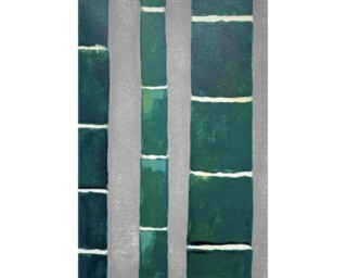 画面には青々とした三本の竹が大きく配され、背景は一色で簡潔にまとめられています。薄暗い空気の中に、梅雨特有の湿り気と、奥へと続く竹林の気配が重なって感じられます。色鮮やかな竹と抑制された背景との対比が画面全体に深みを与えており、縦横の線の配置や余白の取り方など、東山ならではの構図意識もうかがえる一作となっています。