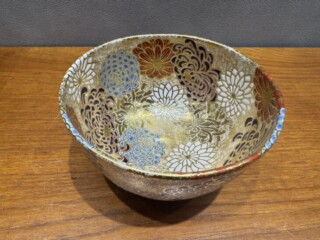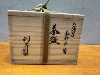 今回のお品物は、菊の金彩が全面にあしらわれた華やかな意匠に加え、裏千家15代家元・鵬雲斎書付が添えられた非常に美しい作品です。