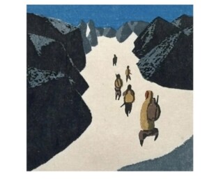 大きく単純化された岩壁の量塊と、その中に広がる白い雪面が印象的に構成されており、そこに小さく登山者像が配置されています。山に向き合う人間の精神性が、簡潔で象徴的な形態によって表現された一枚です。