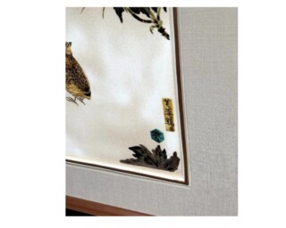 本作では、芙蓉(ふよう)の花と鶉(うずら)が描かれており、濃い紅色に咲く芙蓉から初秋を感じさせる作品です。鶉が芙蓉を見上げていて、画面には余白を大きく取りシンプルな構図ながらも、二羽の穏やかな佇まいと静かな視線が、落ち着いた気配と緊張感をもたらしています。