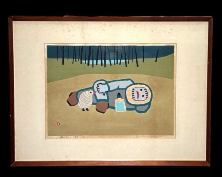 『山湖のほとり』に触れると、まず画面の静謐さが印象に残ります。湖畔と山並みの広がりを平坦な色面と簡潔な線で表現しており、細部を描き込むのではなく、木版画特有の質感や版の余白を活かしている点が特徴です。風景そのものの静けさや空気感を自然に受け取ることができます。