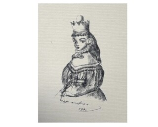 本作も王女を主題に描かれており、髪の毛の一本一本に至るまで丁寧に表現されています。中央に小さく配された人物が、広がりのある余白によって一層印象的に引き立てられ、モノクロならではの味わいが感じられる優雅な作品です。