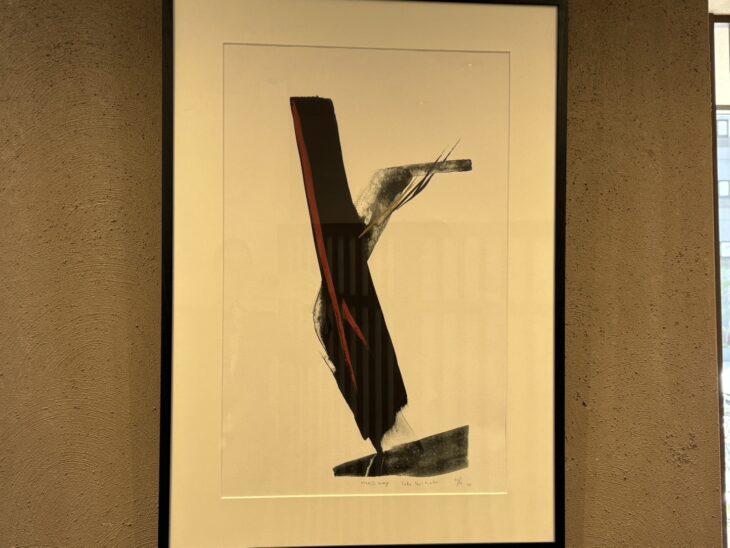 本作『One’s way』は、篠田桃紅ならではの洗練された抽象表現が印象的な作品です。画面には力強い黒のフォルムと、アクセントとして配された赤のラインが大胆に構成されており、墨の濃淡や余白の美しさが作品全体に緊張感と静けさを生み出しています。シンプルでありながらも、筆の勢いや動きが感じられ、作家の感性と精神性が凝縮された一作といえるでしょう。