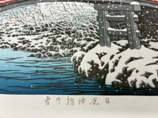 今回ご紹介致しますお品物は川瀬巴水『日光神橋の雪』です。