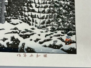 本作品は、栃木県日光市の大谷川に架かる神橋の冬景色を描いています。朱塗りの神橋と真っ白な雪、そして大谷川の深い藍色のコントラストが非常に美しく、近代風景版画の巨匠である巴水ならではの情緒豊かで味わい深い作品です。