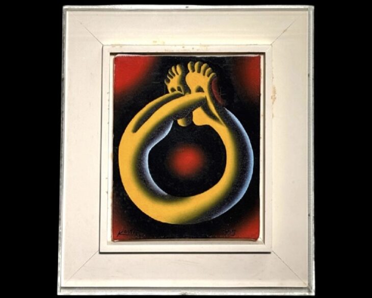 コスタビの作品は、「顔のない」人物像を特徴としています。ジョルジョ・デ・キリコやフェルナン・レジェの影響を受けたその表現は、現代社会における人間の存在や匿名性を象徴的に描き出しています。