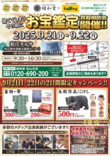 “【緑和堂】いよいよ開催‼ 松江テルサにて出張鑑定会‼ ~そのお品物、お値段知りたくないですか?~【島根県 松江市 買取】” の続きを読む