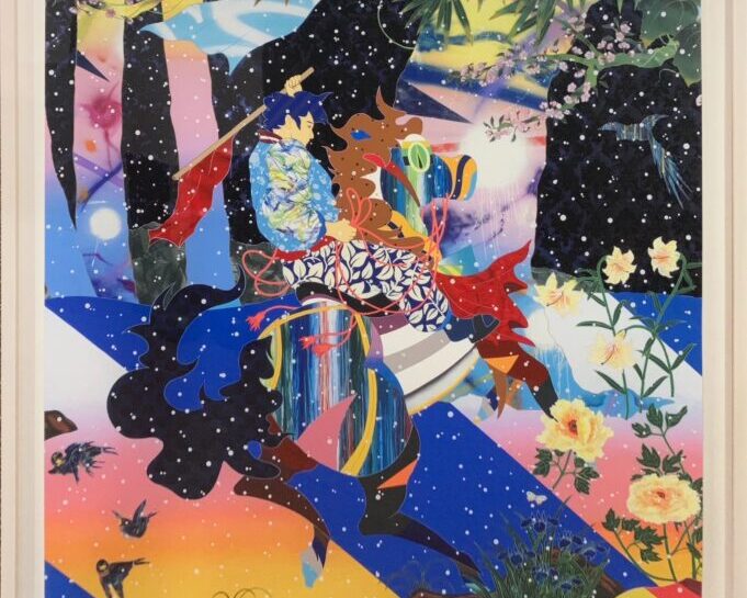 今回のご紹介の松山智一 作『Honestly Gone Going』は先に挙げました「東洋と西洋」の気風がある作品です。フラッグを持ち馬に乗る西洋的ないでたちの青年が中心となり、周りには琳派を思わせる東洋的な草花や動物が描かれています。伝統を振り返りながら前に進んで行く印象を与えられる作品となっています。