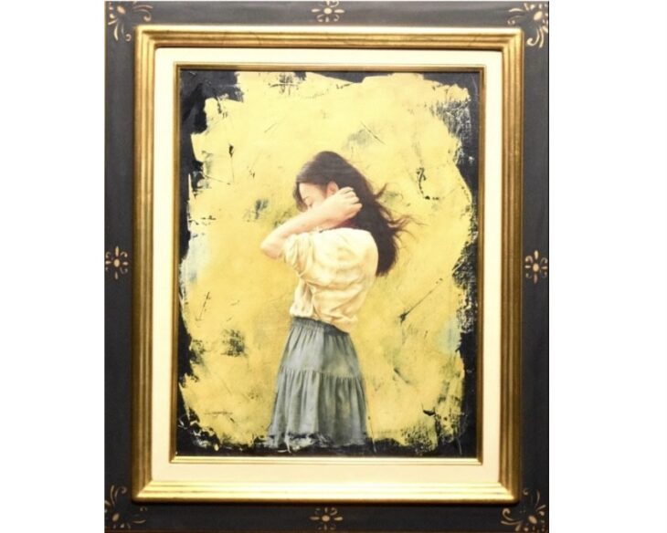 本作は長髪の女性が風に髪を抑える構図となり、背景の強い黄色が特徴的です。風のたなびきを柔らかくも写実的な描画で表現されており、女性の一瞬の美しさが際立つ作品です。