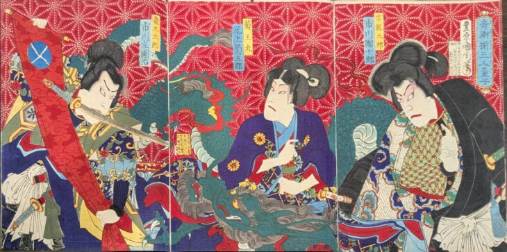 こちらのお品物は人気が高い平家物語の登場人物から派生させた歌舞伎演目の役者絵です。三枚綴が全て揃っており状態も良好であったことによりこちらの評価となりました。