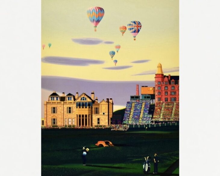 本作はプロゴルファーで伝説的な選手であるジャック・ニクラウスとのコラボで生まれた作品です。柔らかな夕の色彩で描かれており、モチーフとして特徴的な気球も浮かんでおります。。