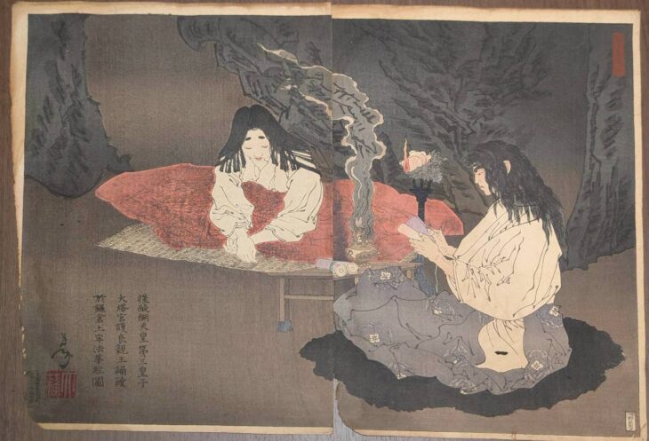 こちらの作品は南北朝時代に活躍した後幽閉された大塔宮護良親王を描いたものです。後醍醐天皇の第三皇子で鎌倉幕府の倒幕で功績がある人物です。その後、足利尊氏と対立したことにより鎌倉で幽閉され、生涯を閉じます。その光景を月岡芳年が描いた作品です。
