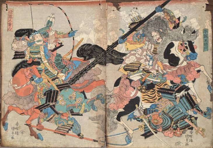 こちらの作品は天慶の乱における大将同士の一騎打を描いた作品です。平将門と俵藤太が一騎打を行ったという事実はありませんが、後世に編まれた軍記物語などの影響から演出の為に生み出された構図ではないかと考えられます。