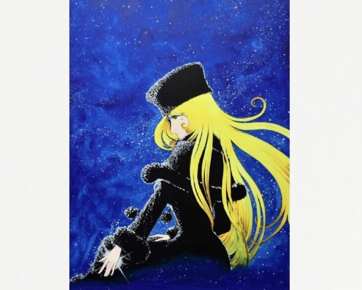 メーテルの長い金髪と黒のロングコートが印象的で、青い背景に繊細な白い縁取りや模様のグラデーションによって宇宙の幻想的な雰囲気を出しています。また、表情を見ると微笑みながら涙を流しているように見えます。