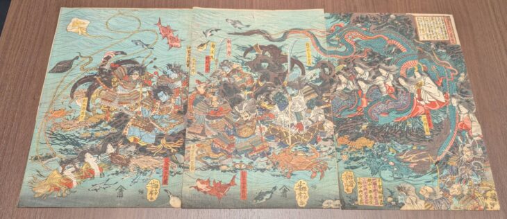 今回ご紹介致しますお品物は歌川芳虎『西海蜑女水底二入テ平家ノ一族ニ見』です。
