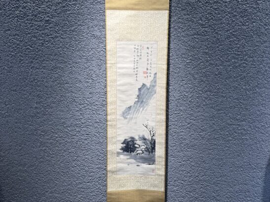 本作では、厳しい寒さを感じさせる山々と、雪に包まれた静かな集落の情景が、淡墨と濃墨の巧みな対比によって描き出されています。竹田特有の細く繊細な筆致や、淡墨を幾重にも重ねた奥行きのある表現により、画面全体からは静謐で澄み切った空気感が伝わってきます。