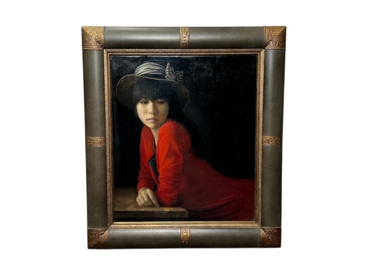 本作品『赤光』では、暗い背景の中に赤い衣をまとった女性が描かれ、落ち着いた表情と控えめな視線が印象的です。鮮烈な赤は米村作品を象徴する色彩のひとつであり、女性像の内面性や情感を際立たせています。写実的でありながらどこか幻想的な雰囲気を漂わせ、鑑賞者に物語を想起させる構成となっています。サインもついており、作品の状態も良好であったことから、今回の評価となりました。