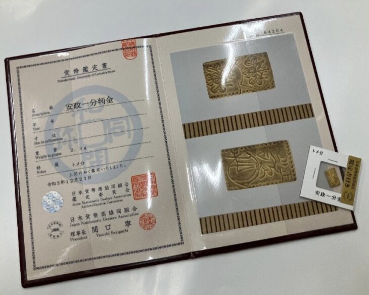 本作は、日本貨幣商協同組合による鑑定書付きの安政一分判金です。