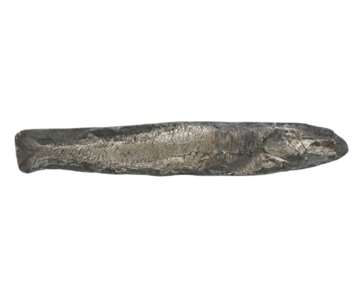 大きな特徴とされる尖った吻部と下あごの鋭い歯が確認でき、全長が把握できるほど状態の良い一品です。化石は欠損や圧縮、風化の影響を受けやすいですが、今回のお品物は特徴を十分に観察できる状態を維持しています。