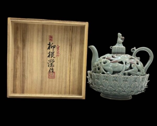 「水注」とは、茶の湯や煎茶道などで使う 水差し・水を注ぐ容器 のことを指します。彼の作品において水注は、特色である高麗青磁技法・象嵌(ぞうがん)・透かし彫りなどを駆使した美術的価値の高い作品となっています。